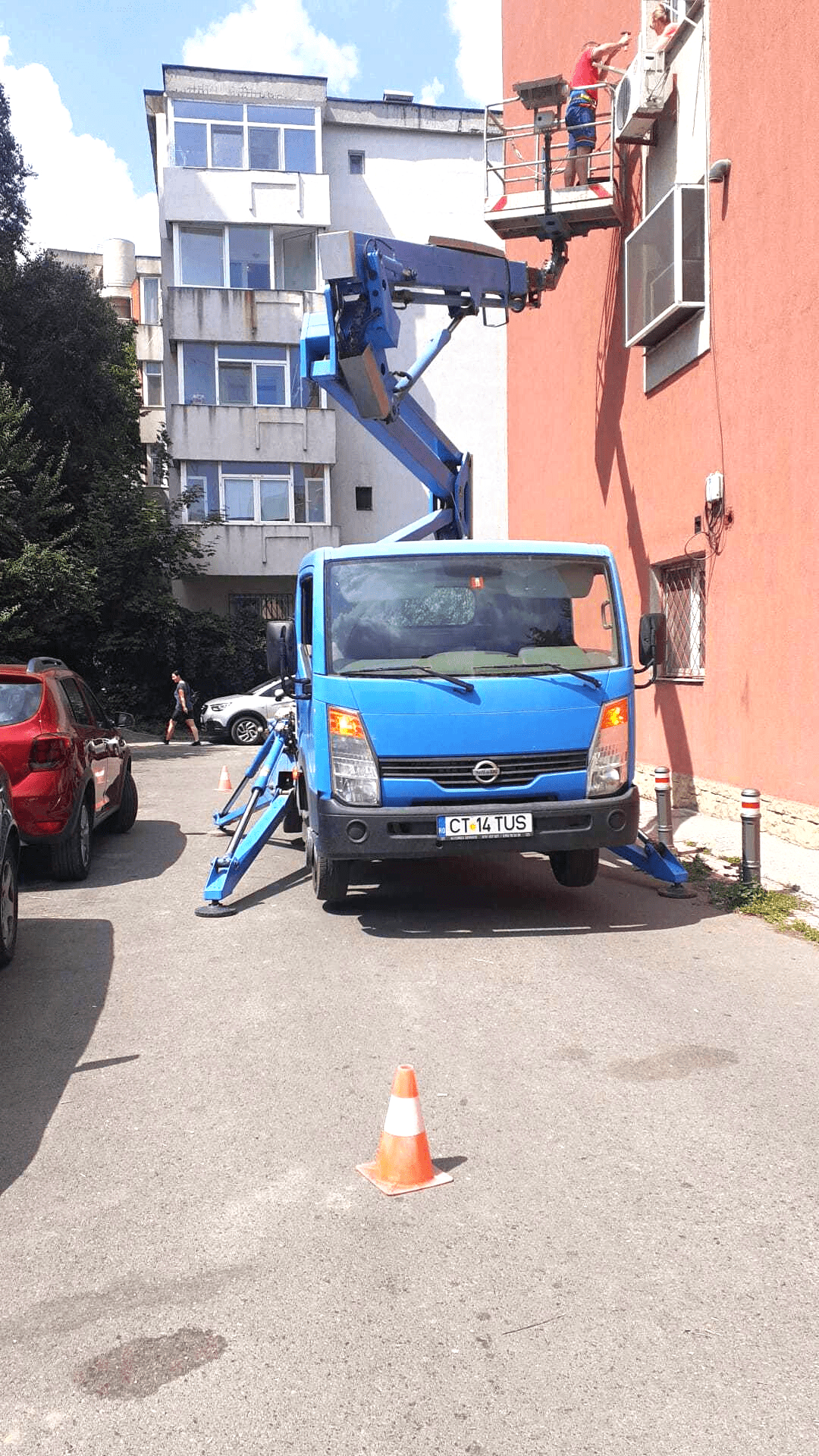 In August 2022, we were tasked with replacing an air conditioner in a residential building in Aleea Timonei, Constanta. The air conditioner was located on the 2nd floor, approximately 5-6 meters high. To handle this job, we sent out our truck-mounted boom lift with a spacious platform to lift a worker and their tools to the job site.