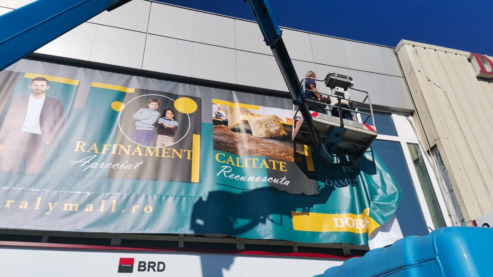 Our first task was to mount a banner at a height of 5 meters on the exterior wall of a shopping centre. Our experienced operator, in conjunction with the client's team, took all necessary safety measures before extending the boom arm to the desired height for the banner's installation. Thanks to the exceptional collaboration between our operator and the client's team, the banner mounting was completed within a mere three hours, leaving our client extremely satisfied with the final results and the swift completion time.