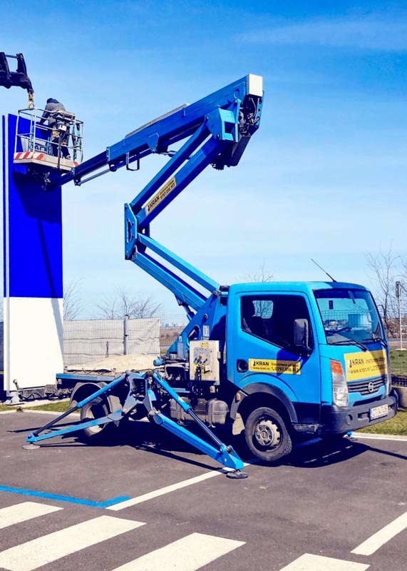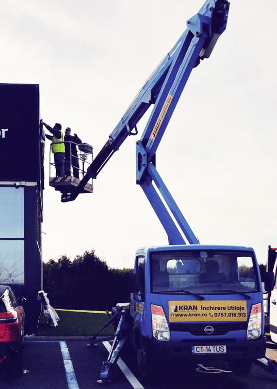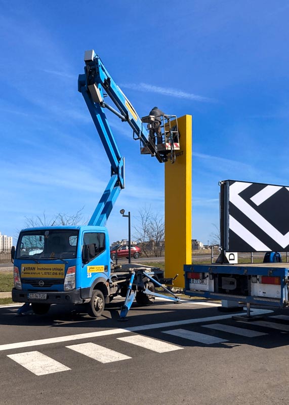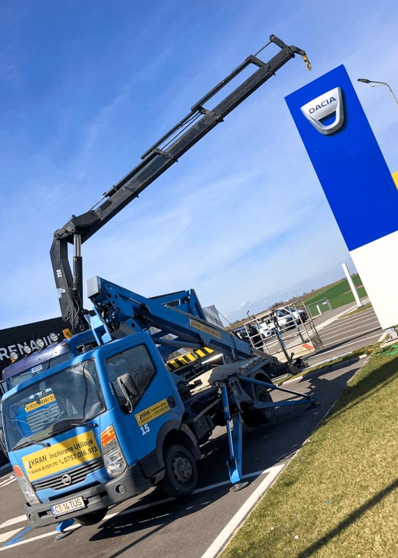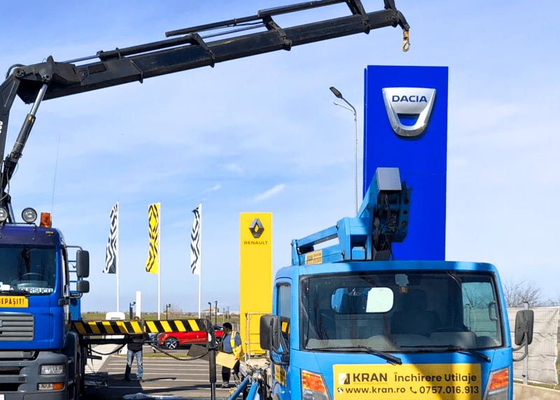 In September 2023, Kran contributed to the installation of a totem for Dacia Auto Haus in Ovidiu. The project involved using a PRB aerial platform to reach a maximum height of 8-9 meters, ensuring efficient assembly of the totem.