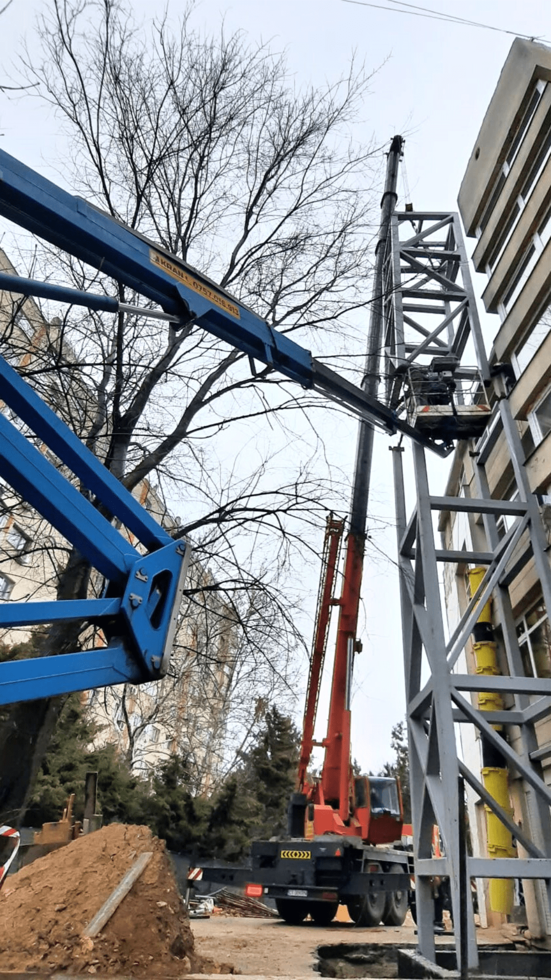 Given the weight and size of the load, as well as the challenging terrain of the site, it was deemed necessary to rent an all-terrain crane. The metal profiles weighed 4 tons each and were 6 meters long, with the work being conducted at a height of 12 meters. In addition to the all-terrain crane, a truck-mounted boom lift was also rented for elevated access, ensuring worker safety and efficient operation.
