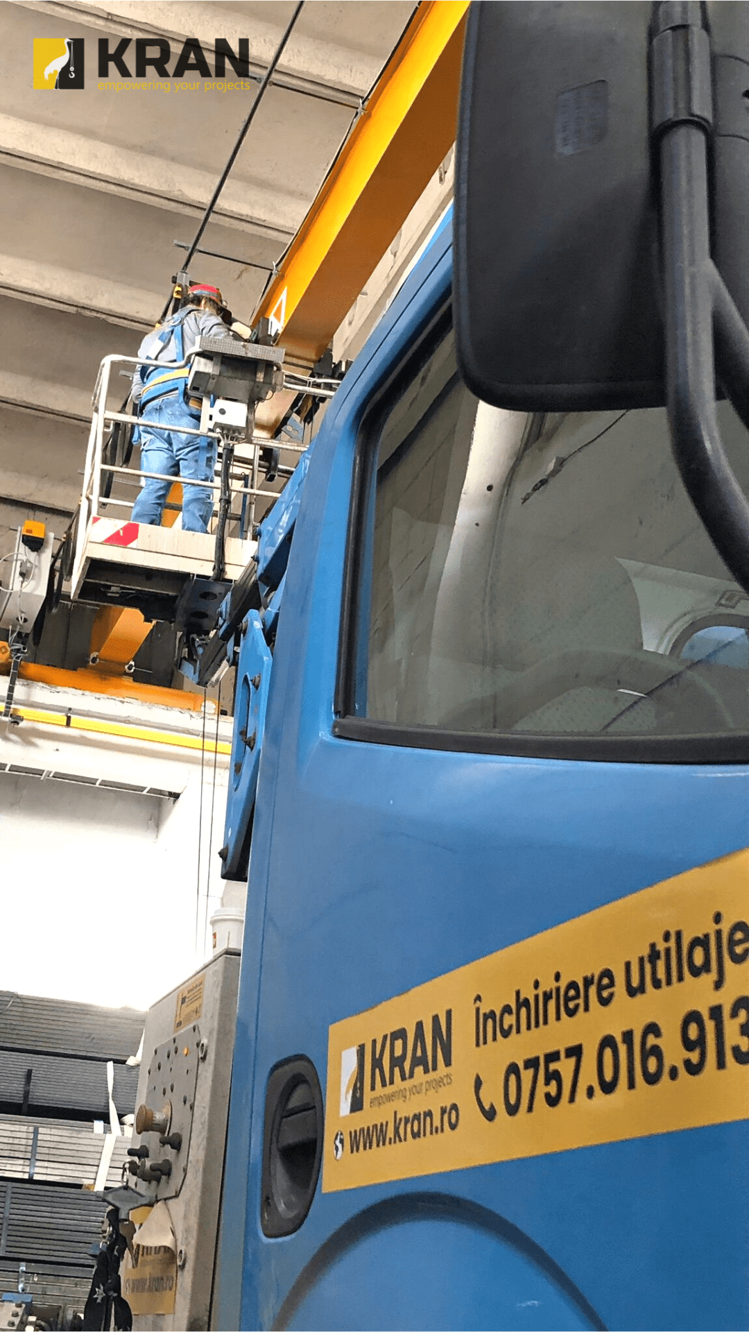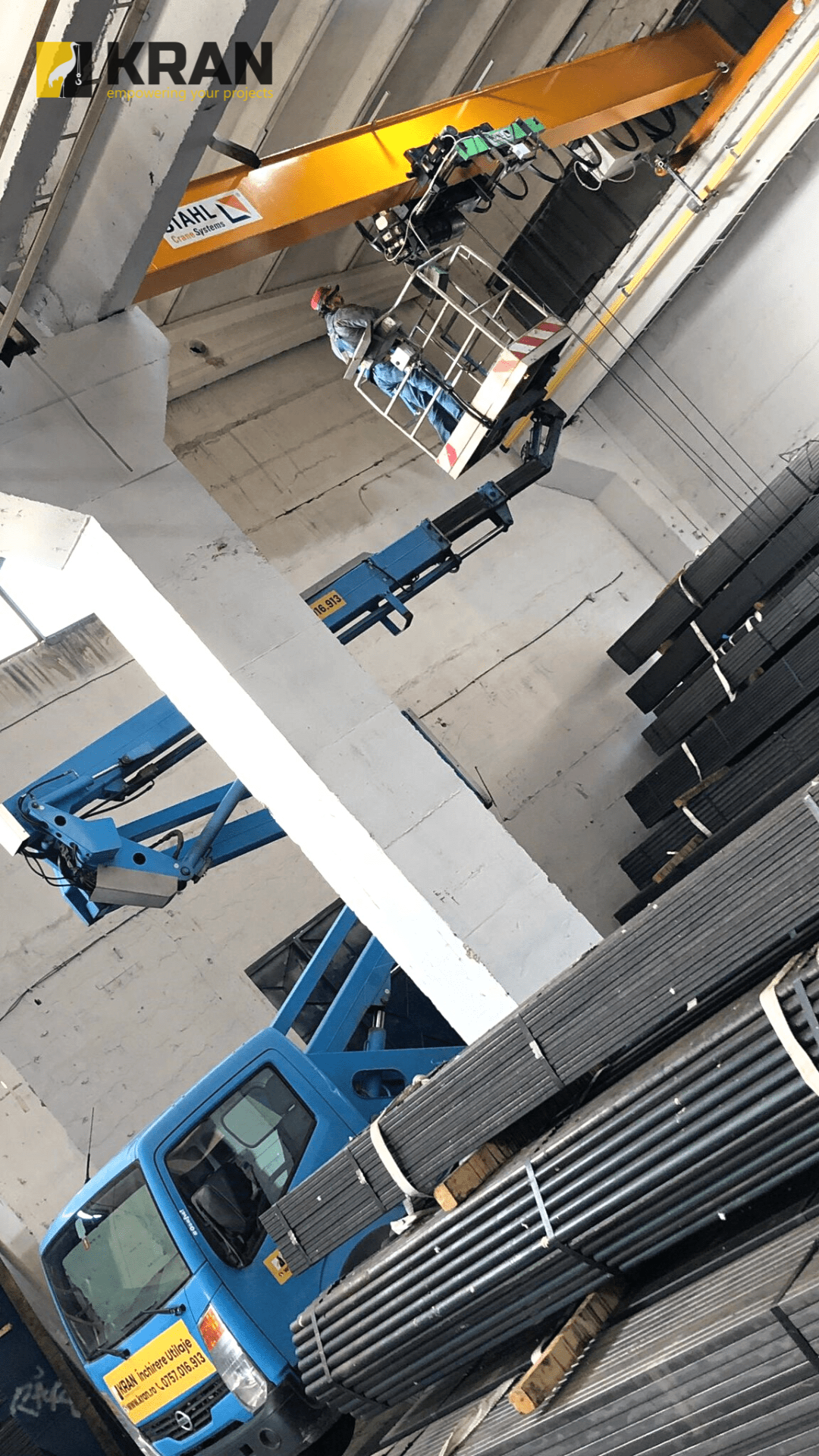 Recently, Kran received a request from a client in the metallurgical industry to assist with the maintenance of their gantry crane inside their warehouse. Our team promptly responded, bringing our efficient boom lift for rent to Port Constanta. While a scissor lift is commonly rented for aerial work indoors, our equipment had easy access to the spacious interior of the warehouse, eliminating the need for a scissor lift rental.