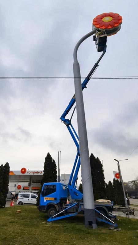 The work was carried out on the Rompetrol logo totem, a flower-shaped structure positioned at a height of 18 meters, with the peak at 21 meters.