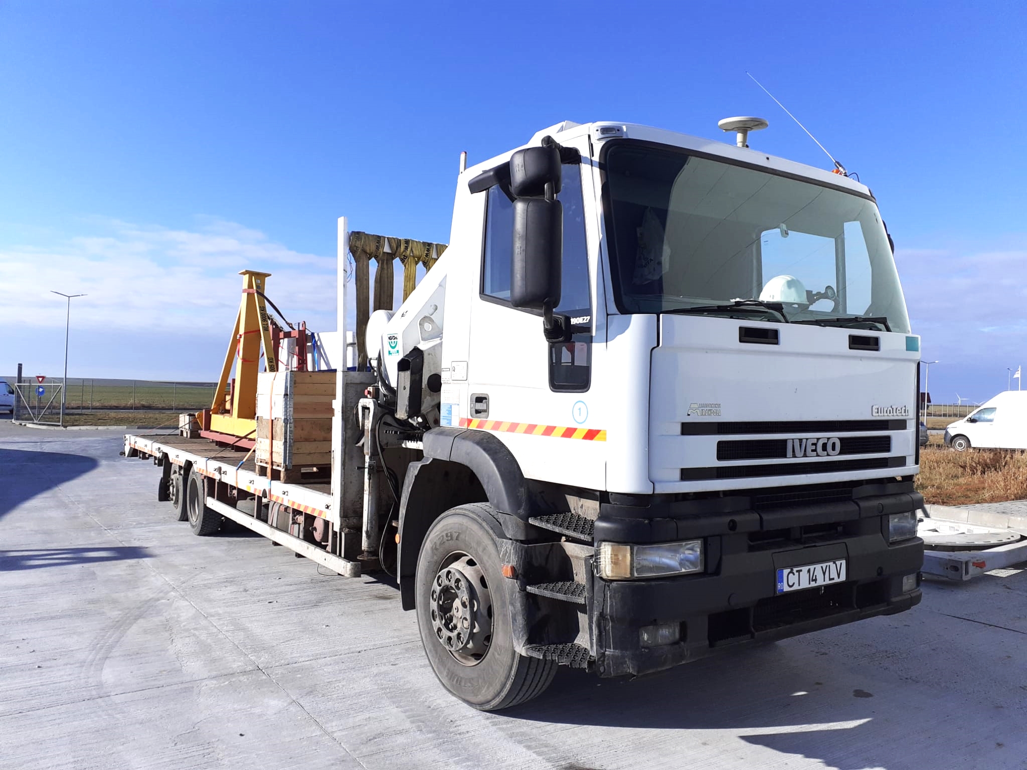 Another day, they needed our mobile crane truck for loading, transportation and unloading of pallets and metal crossbars on the same route as the first time.