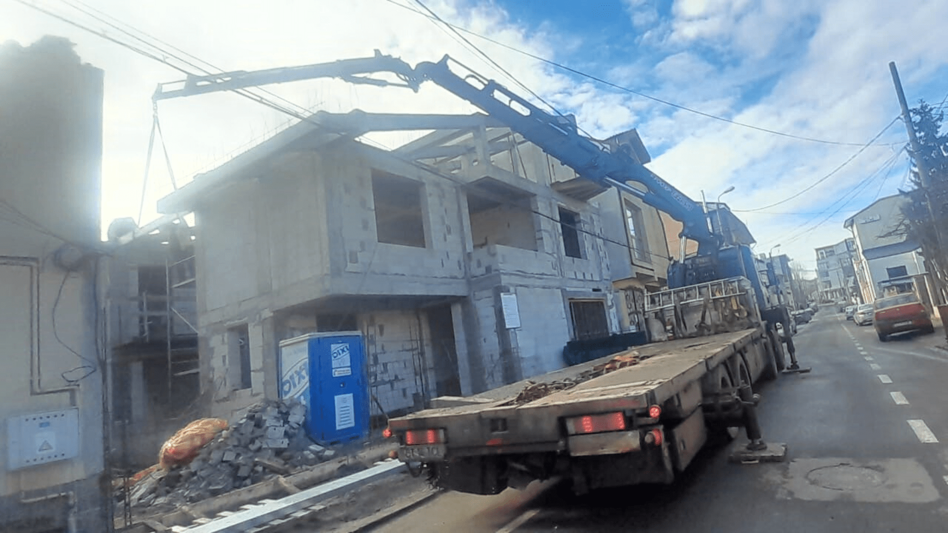 După ce am ajuns la șantier, operatorul nostru a început să ridice cele două grinzi metalice de 200 kg fiecare către clădire. Echipa noastră a ridicat fiecare bucată metalică la o înălțime de 6 metri fără nicio problemă. În plus, închirierea macaralei auto a demonstrat întreaga sa manevrabilitate, fiind capabilă să ajungă la diverse locații. Macaraua auto a ridicat grinzile metalice în poziție orizontală la o distanță de 10 metri de la stradă la clădire. Cu toate acestea, operatorul nostru de macara a reușit să transfere grinzile la șantier într-o oră.