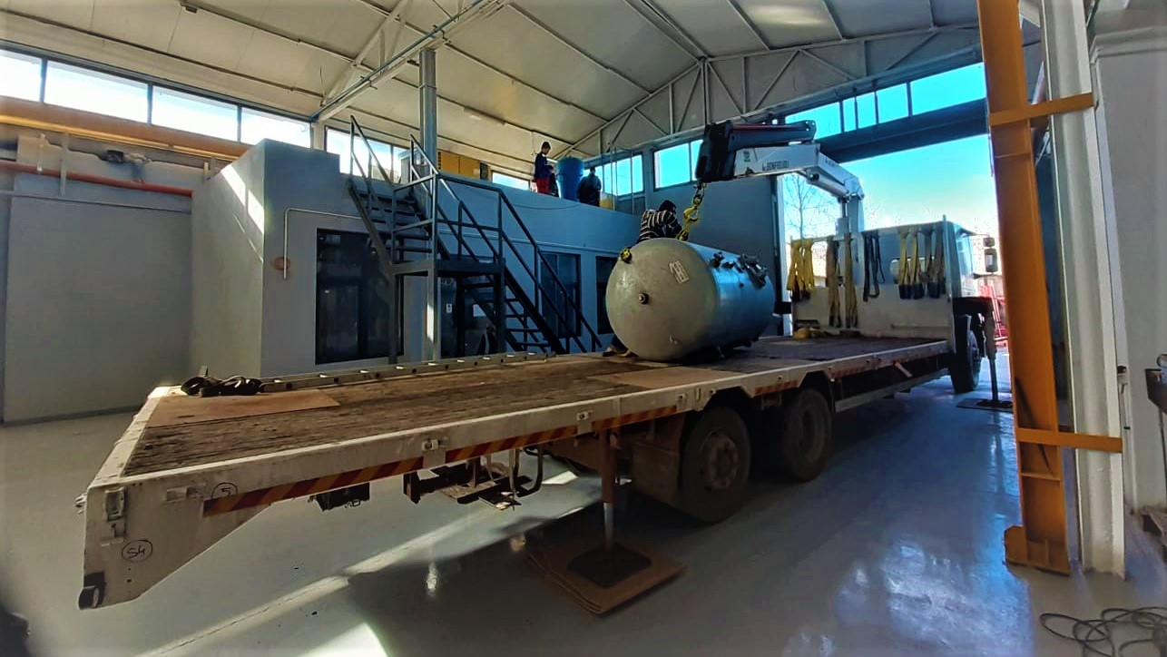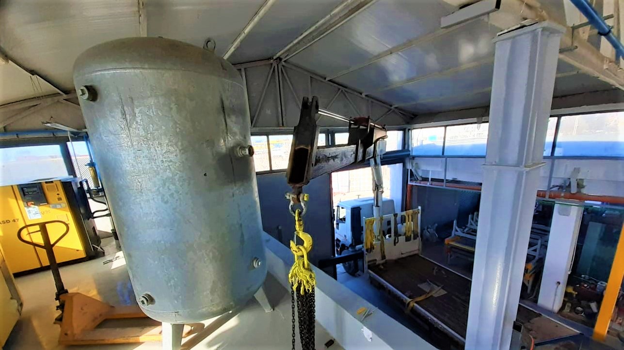 Pentru cea de-a doua lucrare, operatorii noștri au trebuit să ridice și să mute un compresor și un cilindru de compresor la o înălțime de 3 m în interiorul halei fabricii.