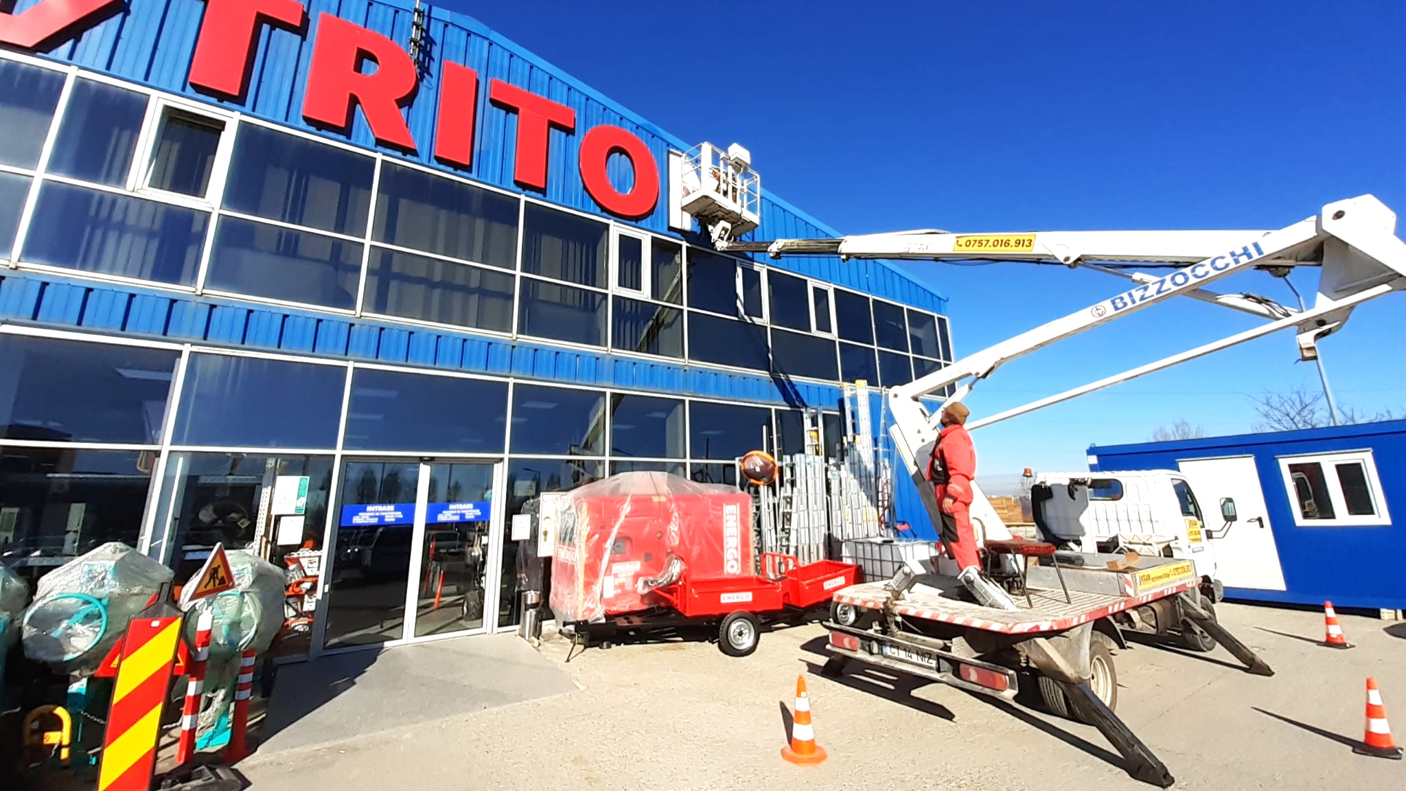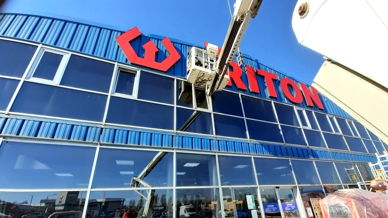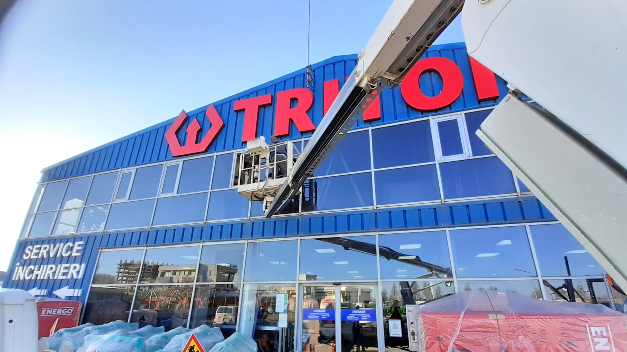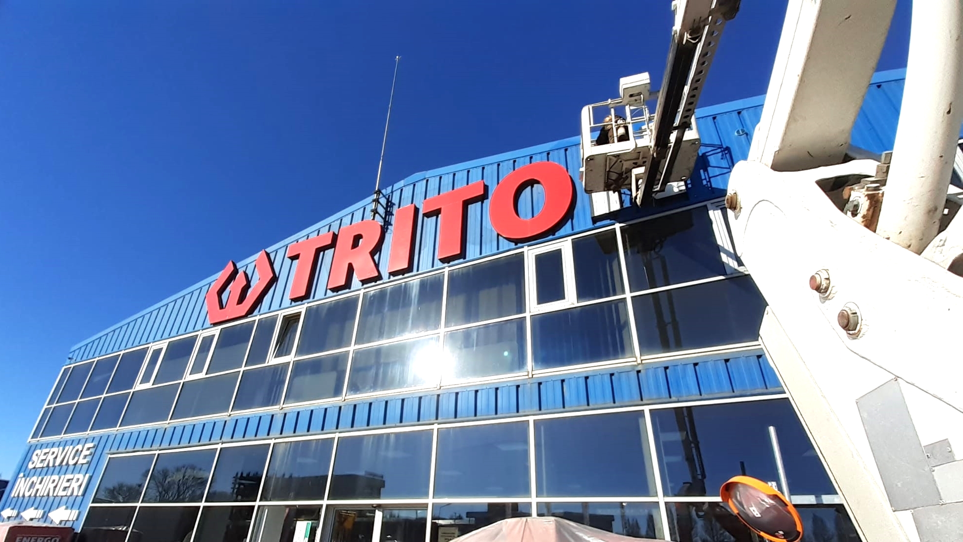 În luna Ianuarie, serviciile de închiriere de nacela PRB Kran au fost solicitate de o companie locală pentru un proiect de schimbare LED-uri de la firma luminoasă a unui magazin.